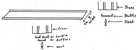 If the heat is not evenly distributed in the dryer, an aluminum panel constructed above the heat source will allow better distribution. This aluminum baffle must either be well supported throughout its length or have the edges turned up to prevent it from sagging. A double baffle system distributes the heat still more evenly or allows a reduced distance between heat source and press.