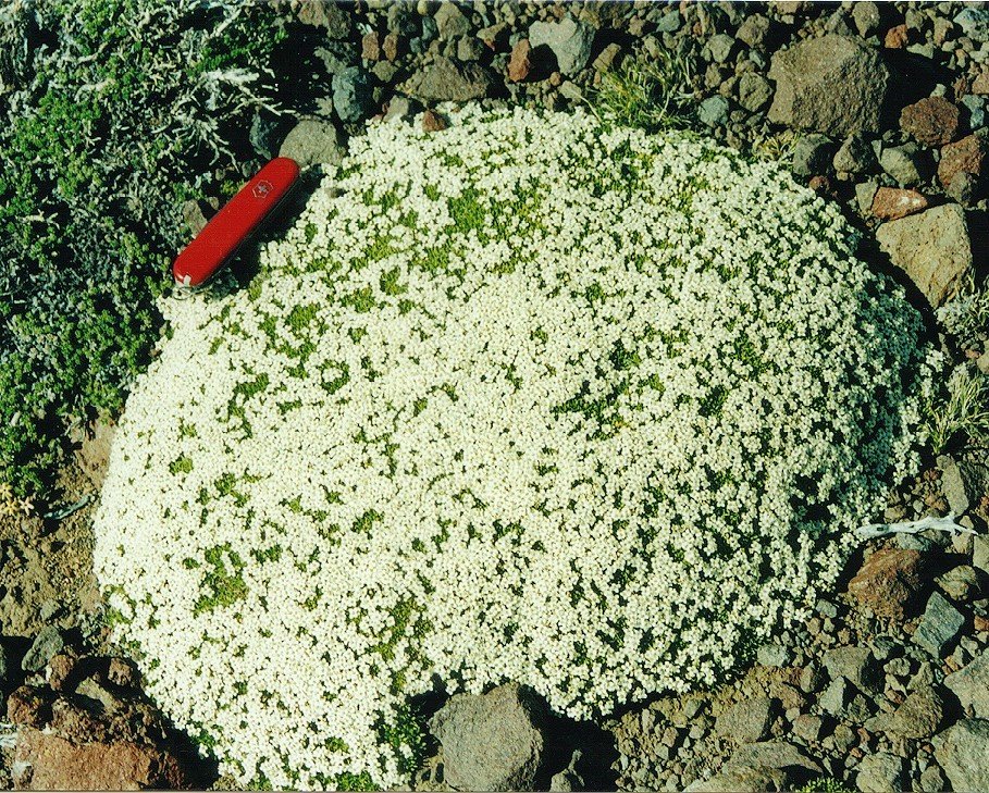 Lithodraba mendocinensis (Haumann) Boelcke (Mendoza, Argentina). A single cushion plant with about 4220 solitary flowers. Photo taken by Dr. Anibal Oscar Prina.