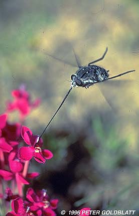 | Figure 3B. Prosoeca sp. nov. inserting its proboscis into the perianth tube of L. oreogena. |