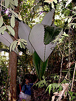 Other areas in Malaysia that I frequented included montane rainforest. Many rare, endemic species of Garcinia on the peninsula are confined to one or a few mountain peaks scattered along the main range or in the eastern part of the peninsula. Garcinia cantleyana var. grandifolia, for example, has only been collected on the top of Gunung Ulu Kali and was last collected in the mid-1980's. Alarmingly, Gunung Ulu Kali is in Genting Highlands, an area famous in Malaysia for its casinos and amusement parks, and is a mere stones throw away from large multistory vacation condominiums. Nevertheless, G. Ulu Kali has remained forested [see picture of Nepenthes in the forest] and I was able to locate several individuals of G. cantleyana var. grandifolia [see picture] some of which were reproductive. While working in the area we observed a siamang (Hylobates syndactylus), a rare gibbon endemic to peninsular Malaysia and Sumatra. |