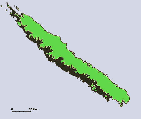 Only about 100 km² (2.2%) of the original ca. 4,500 km² of sclerophyllous forest remain in a more-or-less undisturbed state, with another ca. 250 km² (5.6%) moderately to heavily degraded, and highly secondarized. The remaining stands are also very small (mostly less than 5 ha, and never more than 200 ha), and are highly fragmented and scattered along the west coast of Grande Terre and on a few of its associated islands (Jaffré et al., 1993), which presents additional problems for their continued viability.