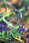Figure 3-6. Prosoeca species foraging on Lapeirousia silenoides-type flowers. In these photogrpahs the flies are in the process of inserting their mouthparts into the floral tubes and have not yet probed deep enough to reach the nectar in the lower part of the tube or brush the anthers and stigmas of the flowers. 3. P. peringueyi visiting L. pyramidalis subsp. regalis. 4. P. peringueyi visiting L. silenoides. P. peringueyi and L. silenoides. 6. P. sp. nov. and L. oreogena.
