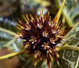 tough, rigid, prickly leaves and purple flowers in globose heads.
