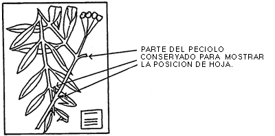 Nunca corte la base del pecíolo y la unión al tallo de una hoja compuesta. Si es posible, conserve algunas bases del pecíolo de las otras hojas y la punta del tallo. No confunda una hoja compuesta grande con un rama con hojas simples. No parta el brote porque el arreglo opuesto o alterno no será evidente. Puede ser que se necesiten dos o más hojas de herbario para espécimen un con hojas muy grandes.