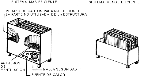 El sistema es más eficiente si tanto la fuente de calor como los lados de las prensas están encerrado por las paredes de la estructura de secado. Cubra toda parte de la estructura que no tenga una prensa. El calor no deberá escaparse con excepción del que pasa través de las prensas de plantas.