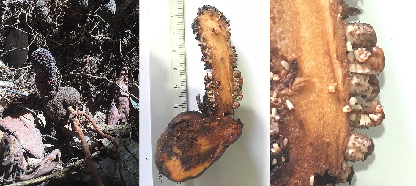 BALANOPHORACEAE. No sooner do we complete the "final" editing of this family for the upcoming Manual Vol. 4 than we receive word from our esteemed collaborator Reinaldo Aguilar of another exciting new discovery on the Península de Osa: photos of a mystery plant found there by Reinaldo confirm his opinion that it does not answer to the description of Helosis cayanensis (Sw.) Spreng. (the only sp. in the family recorded from lowland regions in Costa Rica), nor to the genera Corynaea or Langsdorffia, thus eliminating all the Balanophoraceae accounted for in our Manual draft treatment. Manual contributor Daniel Santamaría (also Reinaldo's cousin!) suggested the mainly South American genus Ombrophytum as a strong candidate, and after a close perusal of Reinaldo's excellent photos, we are convinced that Daniel is correct. We have provisionally identified Reinaldo's find as Ombrophytum violaceum B. Hansen, the only member of its genus recorded from Mesoamerica (by a single collection from Prov. Darién, Panama); however, a final determination must await a more careful study of the actual material (particularly with regard to the male portion of the inflorescence, not clearly shown in the photos).