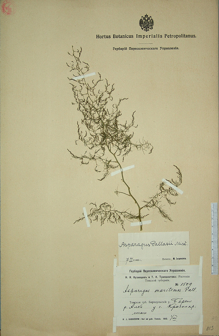 The mounting sheet has the printed title: "Hortus Botanicus Imperialis Petropolitanus. Herbarium of Re-settlement Department." and the State Emblem of the Russian Empire.The label is printed, with the collection locality and the date written by hand.