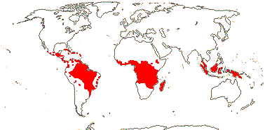 13/500. Largely tropical. Map: from van Steenis and van Balgooy (1966), Wickens (1976), Trop. Afr. Fl. Pl. Ecol. Distr. vol. 1 (2003), FloraBase (consulted 2006) and Stace (2010).