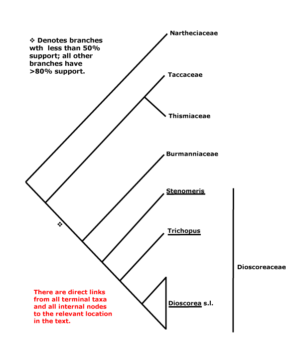 Phylogeny. Much detailed information is provided by Caddick et al. (2002b), although the positions of Stenomeris and Trichopus remained unclear (Viruel et al. 2015 and references); most recently Noda et al. (2020a) placed Stenomeris as sister to Dioscorea.