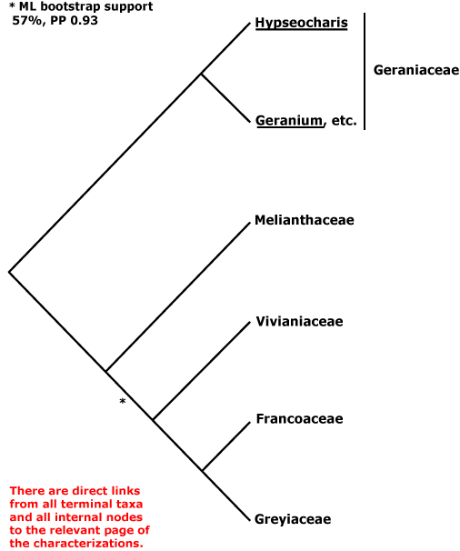 Phylogeny. Savolainen et al. (2000a) found that the order was monophyletic, but with only 52% support (see also Savolainen et al. 2000b). The tree prior to Oct. 2012, but names as used here - [Geraniaceae [[Bersameae + Francoeae] [Vivianieae + Ledocarpeae]]] - was based on these and other studies, although sampling was inconsistent, etc.; Bersameae included Greyia. However, the clade [Greyieae + Francoeae] has been strongly supported (Morgan & Soltis 1993; Price & Palmer 1993; Soltis & Soltis 1997), but Soltis et al. (2007a) found the set of relationships [Geraniaceae [Viviania [Bersama [Francoa + Greyia]]]] (see also Bell et al. 2010). Palazzesi et al. (2012: trnL-F, ITS) on the other hand, recovered a tree [Geraniaceae [Bersameae [Vivianieae [Francoeae + Greyieae]]]], with support for all clades strong except that for the [Vivianieae [Francoeae + Greyieae]] clade, although the chronogram there is based on a tree with the topology [Geraniaceae [Vivianieae [Bersameae [Francoeae + Greyieae]]]].