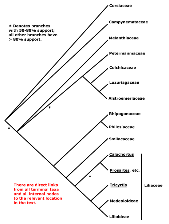Phylogeny. The limits of the family adopted here agree with a phylogeny presented by Hayashi and Kawano (2000), although the sampling there was poor, however relationships within the family have been somewhat in flux. The clade [Clintonia + Medeola] may be sister to the rest of Lilioideae (e.g. Patterson & Givnish 2002; Fay et al. 2006c; Givnish et al. 2016b; J. S. Kim & Kim 2018), from which it differs somewhat morphologically. Calochortus and relatives are not monophyletic in Rudall et al. (2000), but their paraphyly is not clear, either. However, support in general is stronger, and there is a [Calochortoideae + Streptopoideae] clade, if only with weak support, in Patterson and Givnish (2002: esp. ndhF and combined trees) and Rønsted et al. (2005). In Fay et al. (2006c: two genes), the positions of neither Calochortus and Tricyrtis had any support. In the summary tree in Peruzzi et al. (2009), Lilioideae and Streptopoideae are well supported, as is some structure within the former, Calochortus, but not Tricyrtis, linked with the latter. Relationships in Z.-D. Chen et al. (2016) are [Streptopus [Tricyrtis [Clintonia + The Rest]]]. Indeed, the monophyly of Calochortoideae is questionable. Tricyrtis linked with Streptopoideae in J. S. Kim et al. (2013, 2018), and also in the plastome analysis of J. Li et al. (2021), in which the topology is that followed here. Relationships in Givnish et al. (2016b) were [[Streptopoideae + Calochortus] [Tricyrtis + Lilioideae s.l.]], but the latter clade was subtended by a very short branch. Relationships in the nuclear genome tree to be found in W. J. Baker et al. (2021: see Seed Plant Tree) are pectinate, even Gagea and Tulipa do not form a clade. The toplogy in a plastome analysis by R.-S. Lu et al. (2021) is that above; support values were strong.