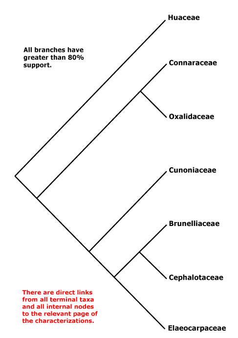 Phylogeny. Molecular data have for some time recovered a not unexpected clade [Oxalidaceae + Connaraceae] (Price & Palmer 1993; Williams et al. 1994; Fernando et al. 1995, etc.), and this also has strong morphological support. The other families are in a clade sister to this pair (e.g. Zhang & Simmons 2006: Cephalotaceae not included; Soltis et al. 2011), but relationships there vary. For the relationships of Brunelliaceae, see Bradford and Barnes (2001) and Murillo-A et al. (2022), although morphological analyses (Miranda-Esquivel 2001; Orozco 2001a; Orozco Pardo 2002) variously mixed Brunelliaceae and Cunoniaceae. The family pair [Brunelliaceae + Cephalotaceae] was retrieved by Davis et al. (2004), Crayn et al. (2006) and M. Sun et al. (2016: support weak); Matthews and Endress (2006b) suggest characters possibly linking these two families. However, Heibl and Renner (2012: focus Oxalis) suggest the relationships [Cunoniaceae [Brunelliaceae [Cephalotaceae + Elaeocarpaceae]]], which implies a rather different scenario of character evolution. Relationships in H.-T. Li et al. (2019) are [Cephalotaceae [Cunoniaceae + Elaeocarpaceae]], with strong support, but Brunelliaceae were not included and only Elaeocarpus and Sloanea of Elaeocarpaceae (but they are in the two clades that make up the family); in Li et al. (2021) relationships - not overly strong - are [[Cephalotaceae + Brunelliaceae] [Cunoniaceae + Elaeocarpaceae]] and the latter relationships were also recovered by X. Li et al. (2021: one taxon/family) while Xia et al. (2022: no Cunoniaceae) found the relationships [Bruniaceae [Cephalotaceae + Elaeocarpaceae]] - these last four are all some version of plastome studies. W. J. Baker et al. (2021a: Seed Plant Tree=) recovered the relationships [Cephalotaceae [Cunoniaceae [Brunelliaceae + Elaeocarpaceae]]], yet another arrangement of these families, and these relationships were also found in the analyses of Murillo-A et al. (2022), the Seed Plant Tree version of ix.2024 and Zuntini et al. (2024) - see also below. However, relationships were [Cunoniaceae [Cephalotaceae [Brunelliaceae + Elaeocarpaceae]]] in the Angiosperms353 analysis of Pillon et al. (2021) although support for the position of Cephalotaceae could have been stronger. Y. Wang et al. (2023: 20 spp., focus on Sloanea, plastome data) suggested the following rather unexpected relationships - [Connarus [Averrhoa [Oxalis [Brunellia [Cephalotus [Crinodendron [Elaeocarpus [Aristotelia [Vallea + Sloanea]]]]]]]]] - and dates were associated with many of the nodes, including a crown-group age of ca 0.4 Ma for Sloanea.
