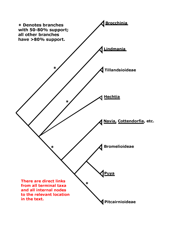 Linder and Rudall (2005) provide a detailed discussion of morphological evolution and diversification in Poales. Subsequently, Bouchenak-Khelladi et al. (2014: tree rather distinctive) looked at correlations of various ecological parameters and diversification; they thought that much diversification in major lineages was Late Cretaceous, even if the origins of those clades was substantially earlier, while Bromeliaceae were a particularly good example of a much more recent radiation with an extremely long phylogenetic fuse, i.e. with a very old stem group. In Linder et al. (2017b: Fig. 5) largely ecophysiological features are displayed on a tree of the order. Males (2016) suggested that a propensity (sic) for aerenchyma formation was plesiomorphic in Poales.