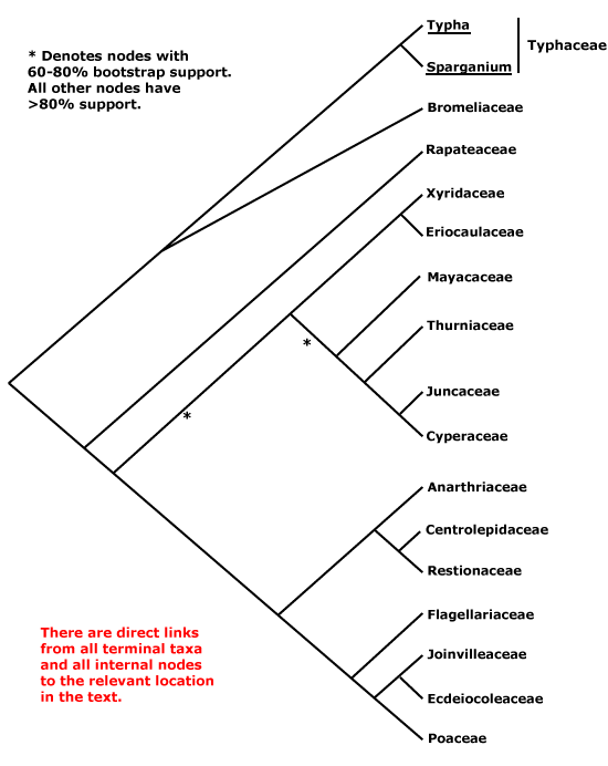 Poaceae and their immediate relatives consistently form a clade, although some details of relationships within it are unclear. Note that in versions 6 and earlier of this site, Eriocaulaceae and their relatives were tentatively associated with the Poaceae group, and analyses of the nuclear PhyB gene recovered a clade [Poaceae [Mayacaceae [Typhaceae + Eriocaulaceae]]] (Hochbach et al. 2018).