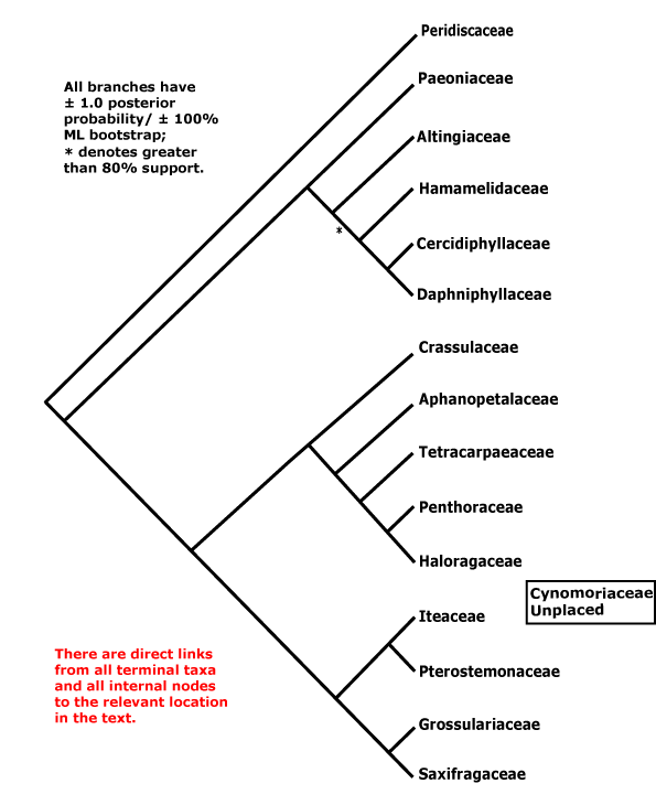 Relationships remain unstable. Thus Li et al. (2021) show relationships as being [Peridiscaceae [[[Daphniphyllaceae + Altingiaceae] [Cercidiphyllaceae + Hamamelidaceae]] [Paeoniaceae [[Iteaceae [Grossulariaceae + Saxifragaceae]] [Cynomoriaceae [Crassulaceae [Aphanopetalaceae [Tetracarpaeaceae [Penthoraceae + Haloragaceae]]]]]]]]]. On the other hand, Zuntini et al. (2024: Suppl. Fig. 4) suggest the relationships [Cynomoriaceae [[Peridiscaceae [Paeoniaceae [Daphniphyllaceae [Hamamelidaceae [Cercidiphyllaceae + Altingiaceae]]]]] [[Iteaceae [Grossulariaceae + Saxifragaceae]] [Crassulaceae [Tetracarpaeaceae [Aphanopetalaceae [Penthoraceae + Haloragaceae]]]]]]] - rather different. Finally, H.-L. Li et al. (2026: ) have recently recovered the relationships [Paeoniaceae [Daphniphyllaceae [Hamamelidaceae [Cercidiphyllaveae + Altingiaceae]]]] [Crassulaceae [Aphanopetalaceae [Peridiscaceae + Haloragaceae]]] [Iteaceae [Grossulariaceae + Saxifragaceae]]. Cynomoriaceae are placed at the end of the account of the order below.