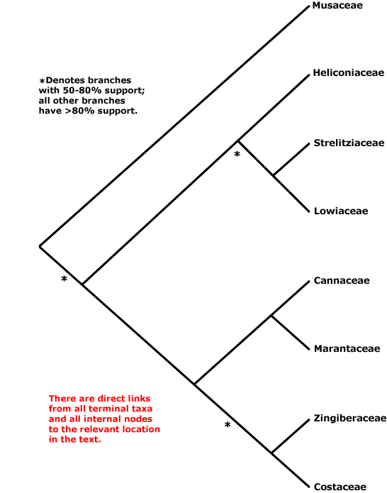 Phylogeny. For a discussion of the relationships of Zingiberales, very clearly monophyletic, see the commelinid page.