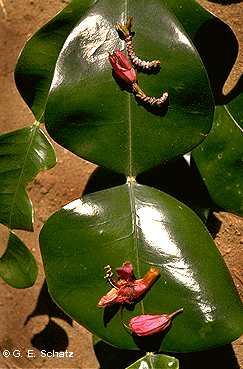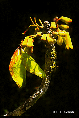 Similarly, Phyllarthron, a genus of Bignoniaceae endemic to Madagascar, has about a dozen species, all of which have phyllodes -- the modified petiole/rachis of a compound leaf that has lost its leaflets -- that function like leaf blades. These phyllodes are clearly adaptations to dry environments. Phyllarthron berniereanum occurs in the extremely dry south, where one would expect to see it. But a number of other species (e.g., P. articulatum, P. cauliflorum, and P. antongiliensis), all of which have these distinctive phyllodes, are found in some of the country's wettest forests.
