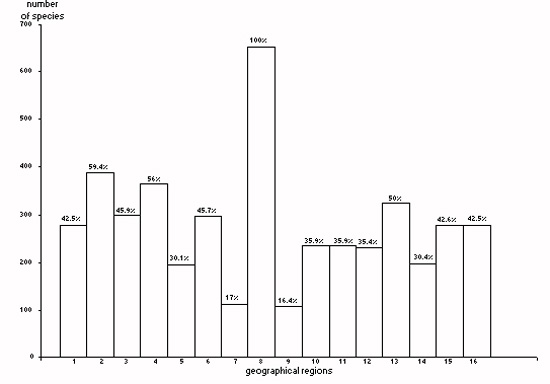 The moss flora of Thailand, with 652 taxa, is comparable to that of neighboring countries or regions, such as Borneo, Java, Malay Peninsula, Myanmar, the Philippines, and Vietnam (Table 2). Phytogeographically, Thailand is a transitional region forming a bridge between the Malayan-Philippine and Sino-Himalayan floras. In the northern part of Thailand plants in the dry lowlands are very poor, but grow vigorously in moist evergreen forests that are developing at altitude above 1,000 meters (Iwatsuki 1972). The mosses of high elevations in the north exhibit affinities to those of eastern Himalayas, Myanmar, and southwestern China (Yunnan, Sichuan, and Guizhou). Many species of the Brachytheciaceae, Entodontaceae, Thuidiaceae, and Hylocomiaceae as well as the species of Bryowijkia Nog., Calyptothecium Mitt., Dixonia Horik. & Ando, and Penzigiella Fleisch. show this affinity. In the southern part of Thailand most species occurring there belong to the Malayan elements known from Malay Peninsula, Java, Sumatra, and its archipelago as well as the Philippines. These include many species of the Calymperaceae and Sematophyllaceae, and those of Hypnodendron (C. Muell.) Lindb. ex Mitt., Mniomalia C. Muell., and Neolindbergia Fleisch. It appears that the Sino-Himalayan elements have rarely extended southwards beyond the central plain in Thailand. The Malayan-Philippine elements clearly predominate in the "Peninsula" and southeastern Thailand. There are a significant number of species that were reported from both northern and peninsular Thailand. These elements usually have much wider distributional patterns throughout East and South Asia and often have pantropic and paleotropic distribution. The diverse distributional patterns of Thai mosses are primarily due to the country's diverse climates and landscapes. The climates in the large central plain and the Korat Plateau in the east are dry and are intermediate between the monsoon regions and tropical regions. A broad zonation belt is formed centrally, which separates the country into two climatic zones. It is practical in biogeographical standpoint to divide Thailand into two floristic regions, the Sino-Himalayan region in the north and northeast and the Malayan region in the southeast and the "Peninsula". The distribution of the pteridophytes in Thailand is clearly determined by the climatic factors (Iwatsuki 1972). The floristic affinities of Thai mosses with adjacent East and South Asian countries are shown in Fig. 1.