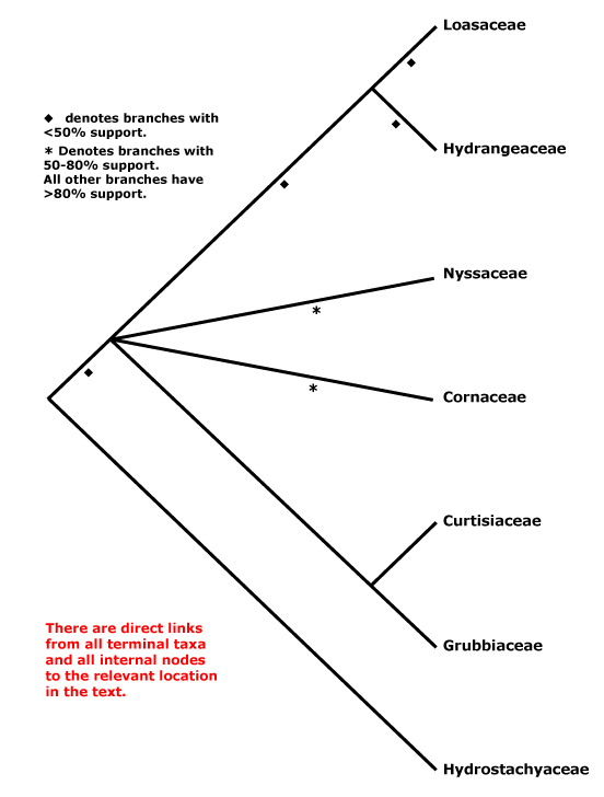 Xiang et al. (2011) found a set of relationships [[Cornaceae [Curtisiaceae + Grubbiaceae]], Nyssaceae s.l., [Hydrostachyaceae [Hydrangeaceae + Loasaceae]]]]. Here taxon sampling is good and many of the relationships are well supported, however, nuclear 26S rDNA data alone suggested somewhat different relationships than did the six chloroplast genes, with Hydrostachys being embedded in Cornaceae s.l.. Using chloroplast genes alone a position of Nyssaceae as sister to [Hydrostachyaceae [Hydrangeaceae + Loasaceae]] had good support, and relationships suggested by this chloroplast phylogeny are followed here (see also most relationships in Schenk & Hufford 2010, but some nodes with weak support). A study using whole chloroplast genomes, but with skimpy sampling (15 genomes, four families), recovered similar relationships (Fu et al. 2017) as did the study by H.-T. Li et al. (2019); Fu et al. (2019a) added another 67 plastid genomes with the same result (see also below). However, there is little in the way of morphology to pin to the basal nodes, and as Xiang et al. (2011) noted, this new topology makes character evolution interesting. Morphological analyses (fruit characters) of extant plus fossil members of Cornales found quite strong support (93% bootstrap) for a [Cornaceae, Nyssaceae, Curtisiaceae, Grubbiaceae] clade (Atkinson 2018), but not for much else, while analyses that included only extant taxa showed very little support for any relationships.