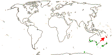 1/1. New Caledonia, on ultrabasic rocks (map: fossil localities green, from Jarzen & Pocknall 1993). [Photo - Flower]