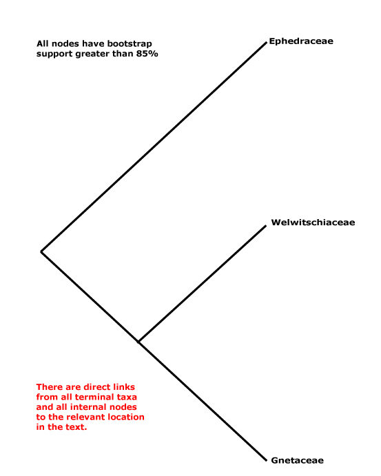 Phylogeny. Within Gnetales the relationships [Ephedra [Gnetum + Welwitschia]] have consistently been recovered (e.g. Price 1996).