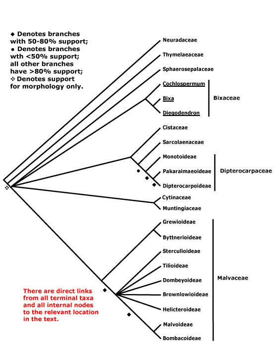 Hernández-Gutiérrez and Magallón (2019) recently studied relationships throughout the order. The positions of Neuradaceae, Cytinaceae and Muntingiaceae were unclear, and although relationships in their Bayesian analysis are most similar to those below, the topology of that tree differs from the tree that they used to discuss their dating analyses. [[Malvaceae + Muntingiaceae] [[Thymeleaceae [Cytinaceae + Neuradaceae]] [[Sphaerosepalaceae + Bixaceae] [Cistaceae [Sarcolaenaceae + Dipterocarpaceae]]]]]. Many of the relationships suggested in the comprehensive plastome analysis of H.-T. Li et al. (2021) did no+ have that strong support. Although with a focus on the Aquilaria area (Thymeleaceae), broader relationships in S. Y. Lee et al. (2022b) are [Dipterocarpaceae [Bixaceae + Thymeleaceae]] - Malvaceae are the outgroup. The recent study by Colli-Silva et al. (2025: 194 genera [just over half in the order], 309 genes of the Angiosperms353 data set) provides the basis for the family sequence and infrafamilial taxa recognized below, although support for the positions of Sphaerosepalaceae, the [Cytinaceae + Muntingiaceae] clade, for some subfamilies and tribes in Malvaceae, etc. are weak, Pakairaimea and members of Dipterocarpaceae-Dryobalanopseae were not included, and about half a dozen genera of Malvaceae that were included were left unplaced.