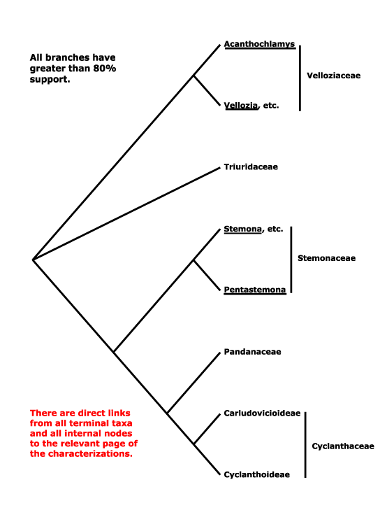 The composition of Pandanales is somewhat unexpected, including as it does some of the most delicate (Triuridaceae), most woody and robust (Pandanaceae) and most drought-tolerant (Velloziaceae) monocots. The phylogeny that was on this site for some time, [Velloziaceae [Stemonaceae [Triuridaceae [Cyclanthaceae + Pandanaceae]]]], was taken from Behnke et al. (2000, 2013), and especially Caddick et al. (2002a), Davis et al. (2004: Fig. 1) and Mennes et al. (2013), although even in the last study, quite comprehensive, the position of Stemonaceae was not very strongly supported. Indeed, the composition of the order seems stable, even if relatiosnhips within it have been somewhaat unclear. Soto Gomez et al. (2020) found that Sciaphila was sister to Pentastoma in parsimony analyses of plastid data, although Janssen and Bremer (2003: Triuris minus) had suggested a somewhat different set of relationships. In the plastome analysis of Wanga et al. (2021: good support, poor sampling) relationships were [Stemonaceae [Cyclanthaceae + Pandanaceae]]. The [Pandanaceae + Cyclanthaceae] clade is found consistently and it also has strong morphological support.