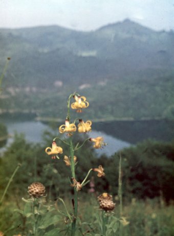 Lilium ledebourii and a large, dark, vine-brown-flowered